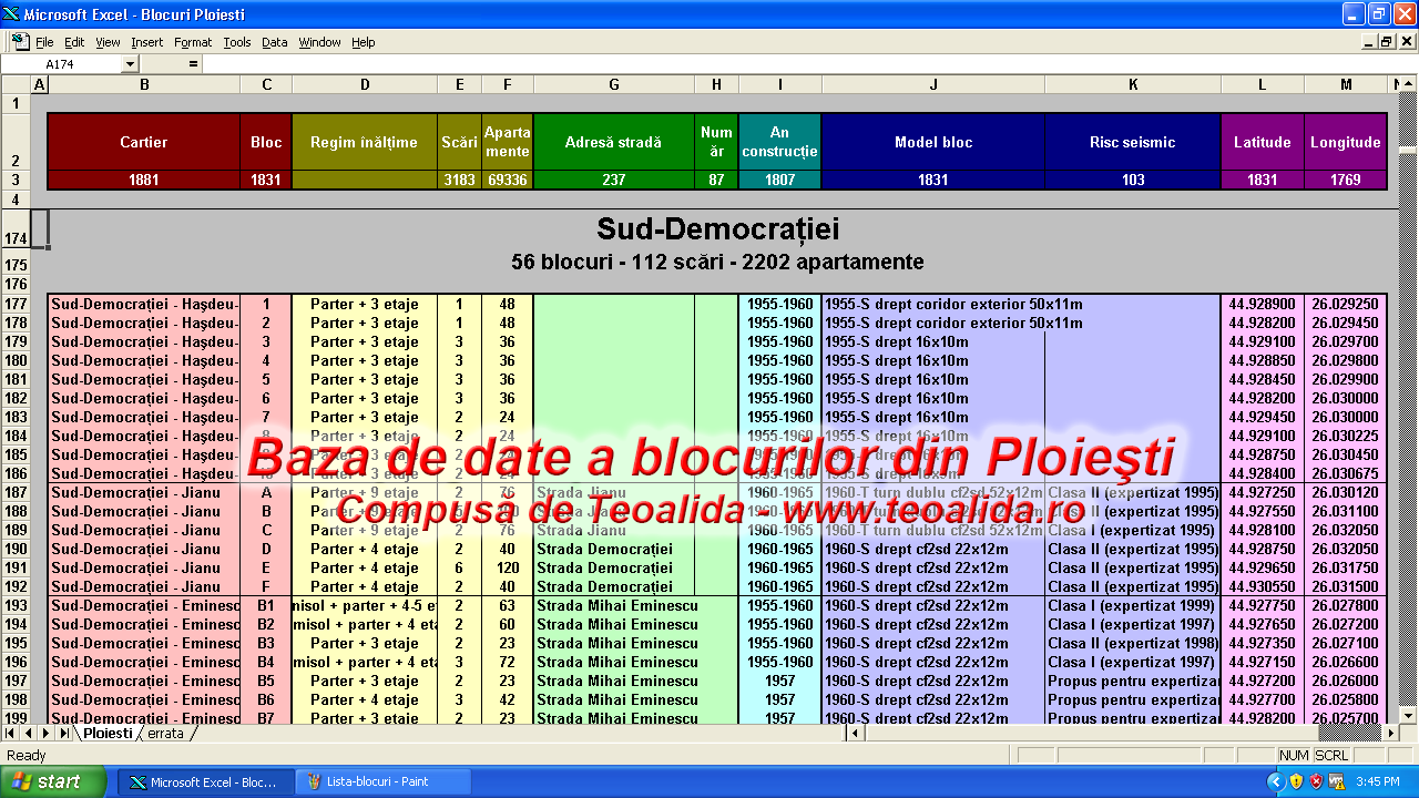 În 2005 am compus în Excel statistica blocurilor și apartamentelor din Ploiești, extinsă în 2007-2008 către orașele din jurul Ploieștiului, inclusiv București și Târgoviste. Fiecare rând din tabel fiind un model de bloc, indicând numărul de etaje și apartamente, înmulțit cu numărul de exemplare din acel bloc, pentru calcularea numărului de blocuri și apartamente din fiecare cartier și apoi oraș. Tabelul nu conținea rânduri pentru blocuri individuale.